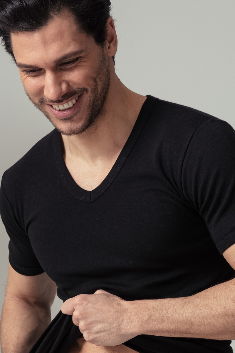 Maglia a mezza manica in cotone felpato. Capo intimo da uomo con collo a punta comodo da indossare anche sotto camice o oltri capi esternabili. La composizione del tessuto ti donerà calore permettendo al tempo stesso la giusta traspirazione.